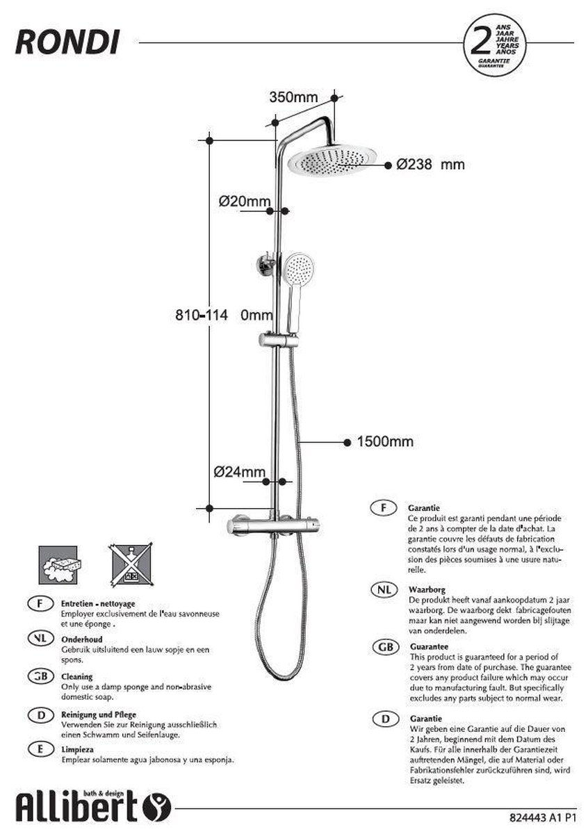 Wacht niet te lang met investeren in uw comfort. De Allibert Rondi Douchekolom wordt geleverd met een fabrieksgarantie van maar liefst 10 jaar, waardoor u verzekerd bent van kwaliteit en vakmanschap. Reparaties worden afgehandeld via carry-in service, zodat u snel weer kunt genieten van een heerlijk warme en ontspannen douche.