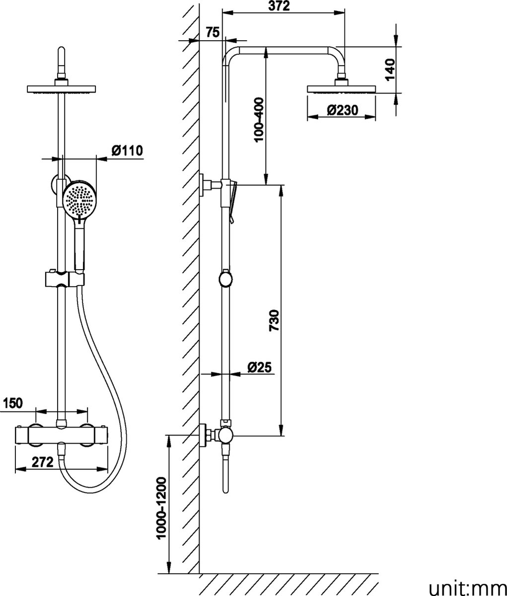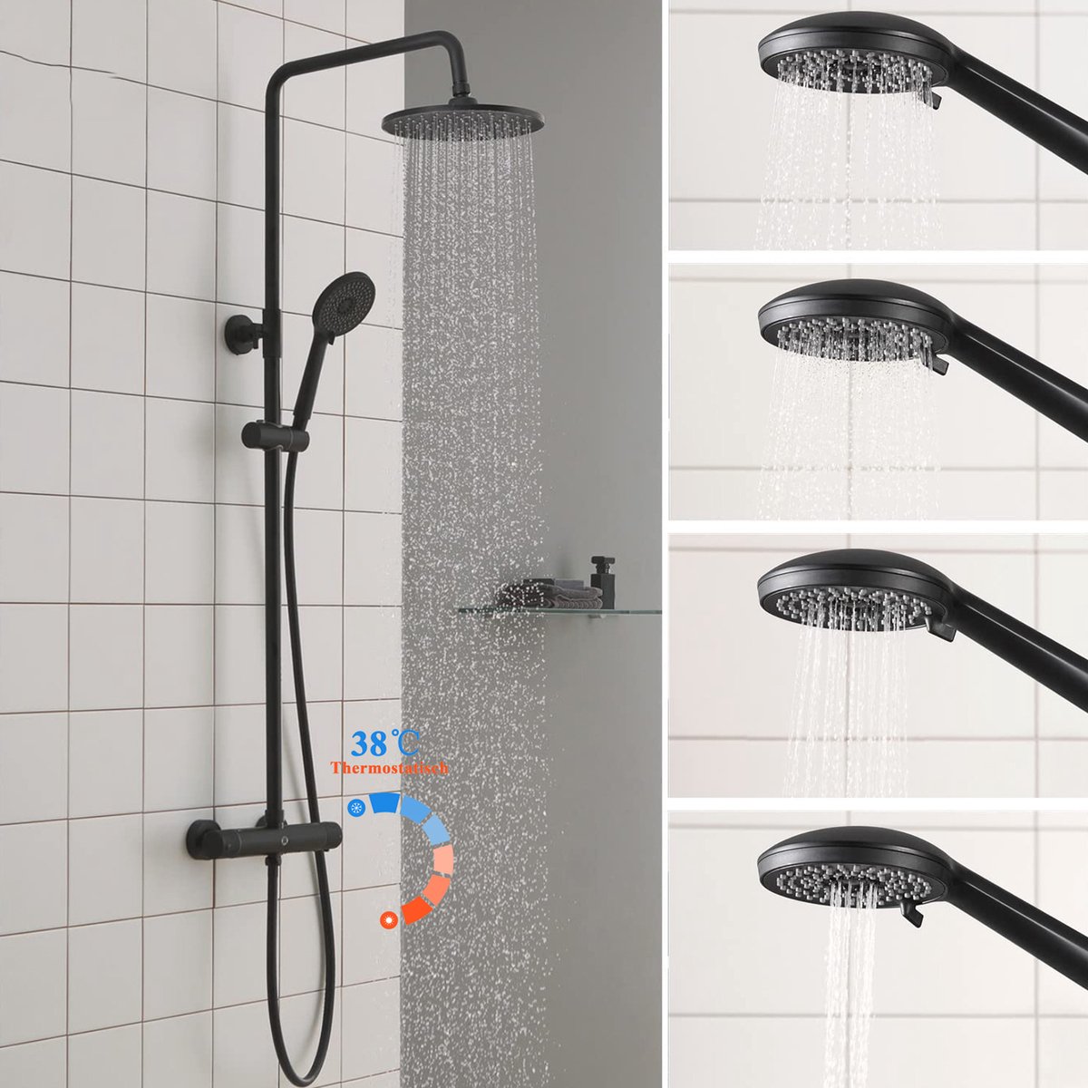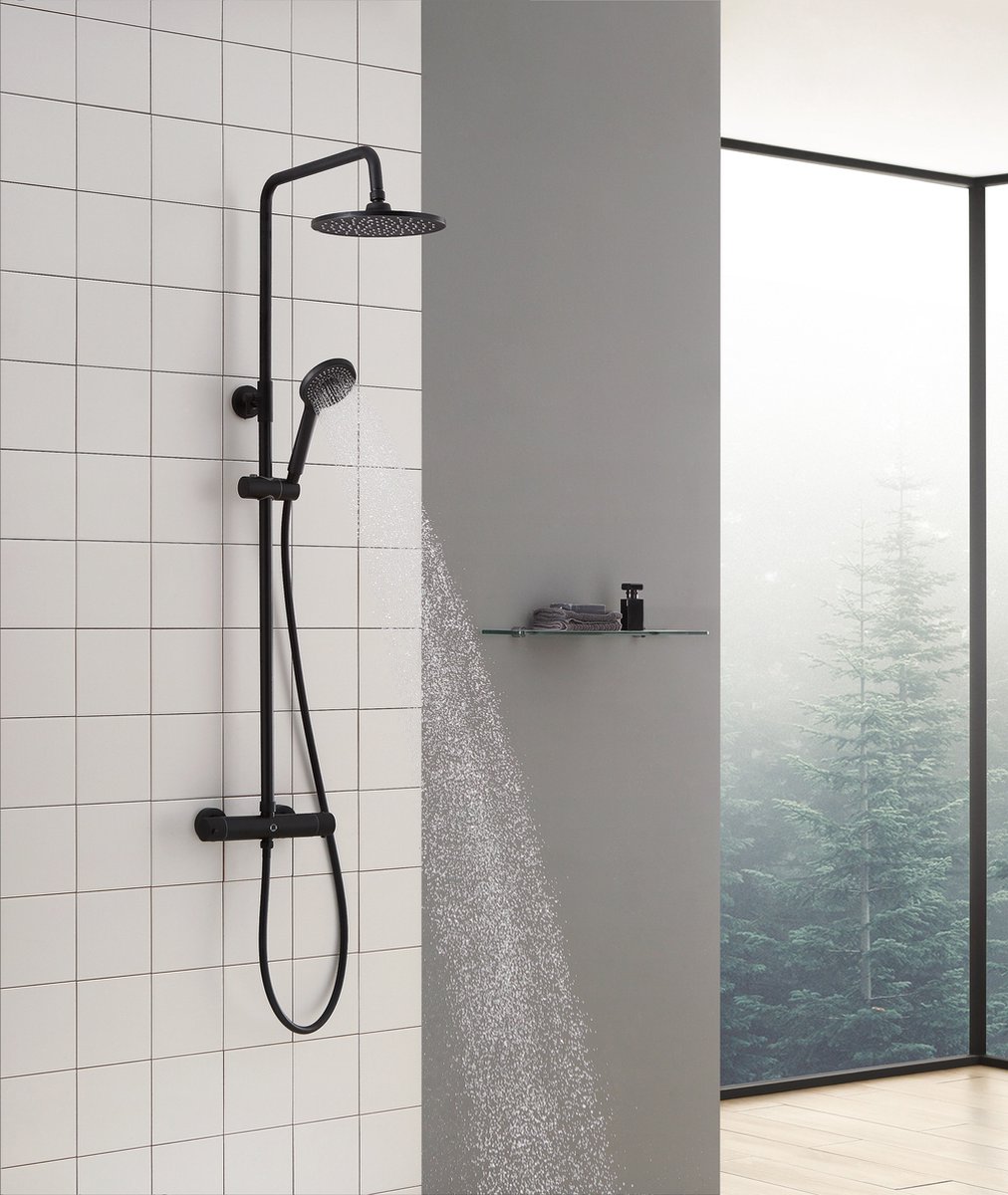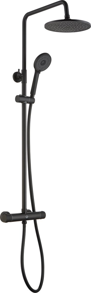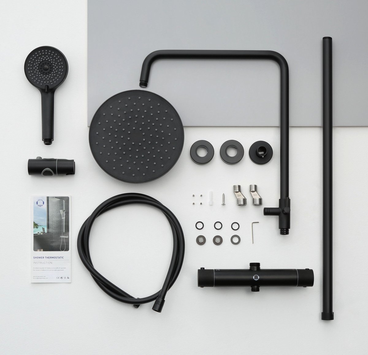De set wordt eenvoudig aangesloten op bestaande opbouwfittingen met een extra anti-vergrendelbare 800 mm doucheslang. De inclusief meegeleverde 150 cm metalen doucheslang maakt de installatie snel en probleemloos. De ronde vorm van de thermostaat en de bevestigingssteunen die in hoogte verstelbaar zijn, zorgen voor een strakke en flexibele montage.