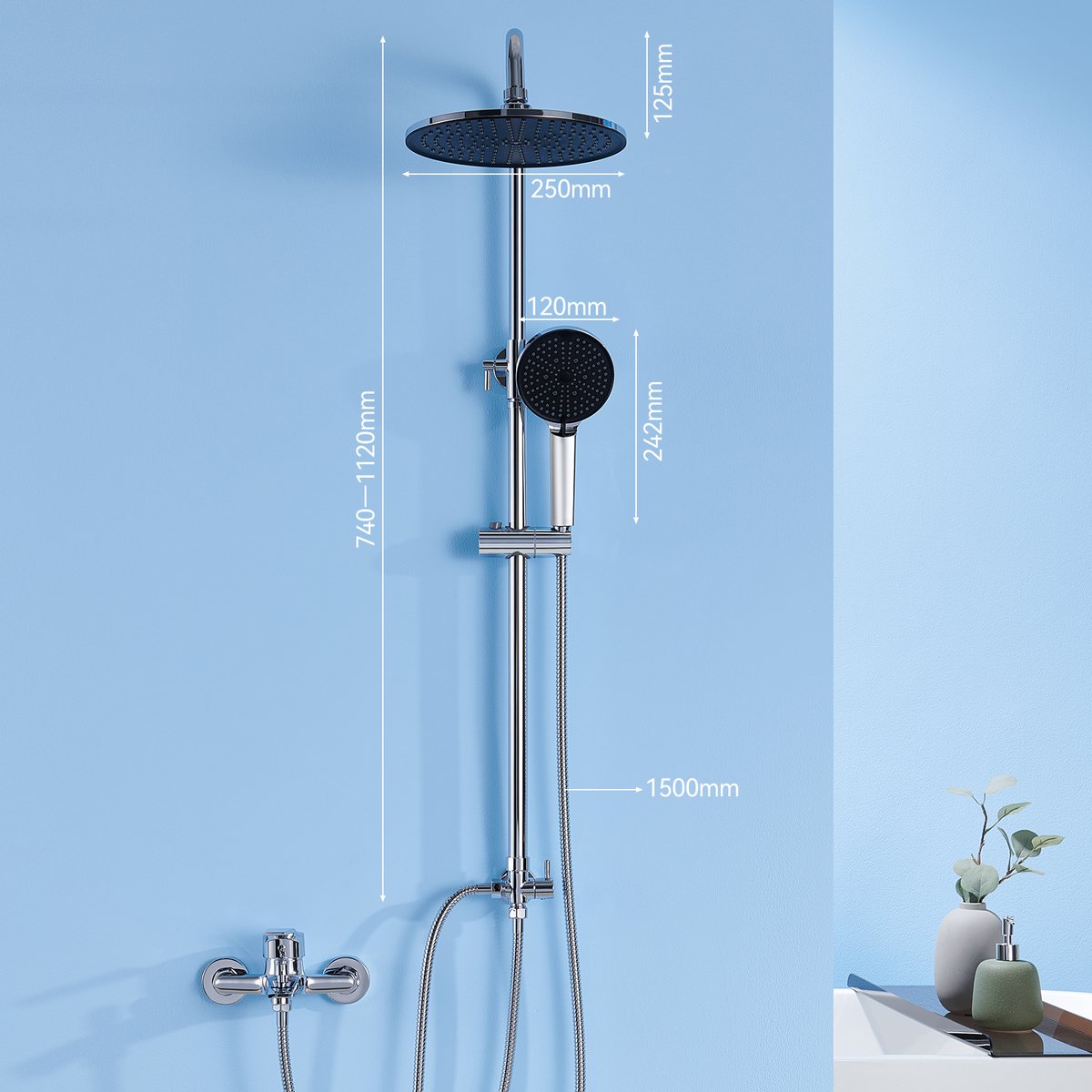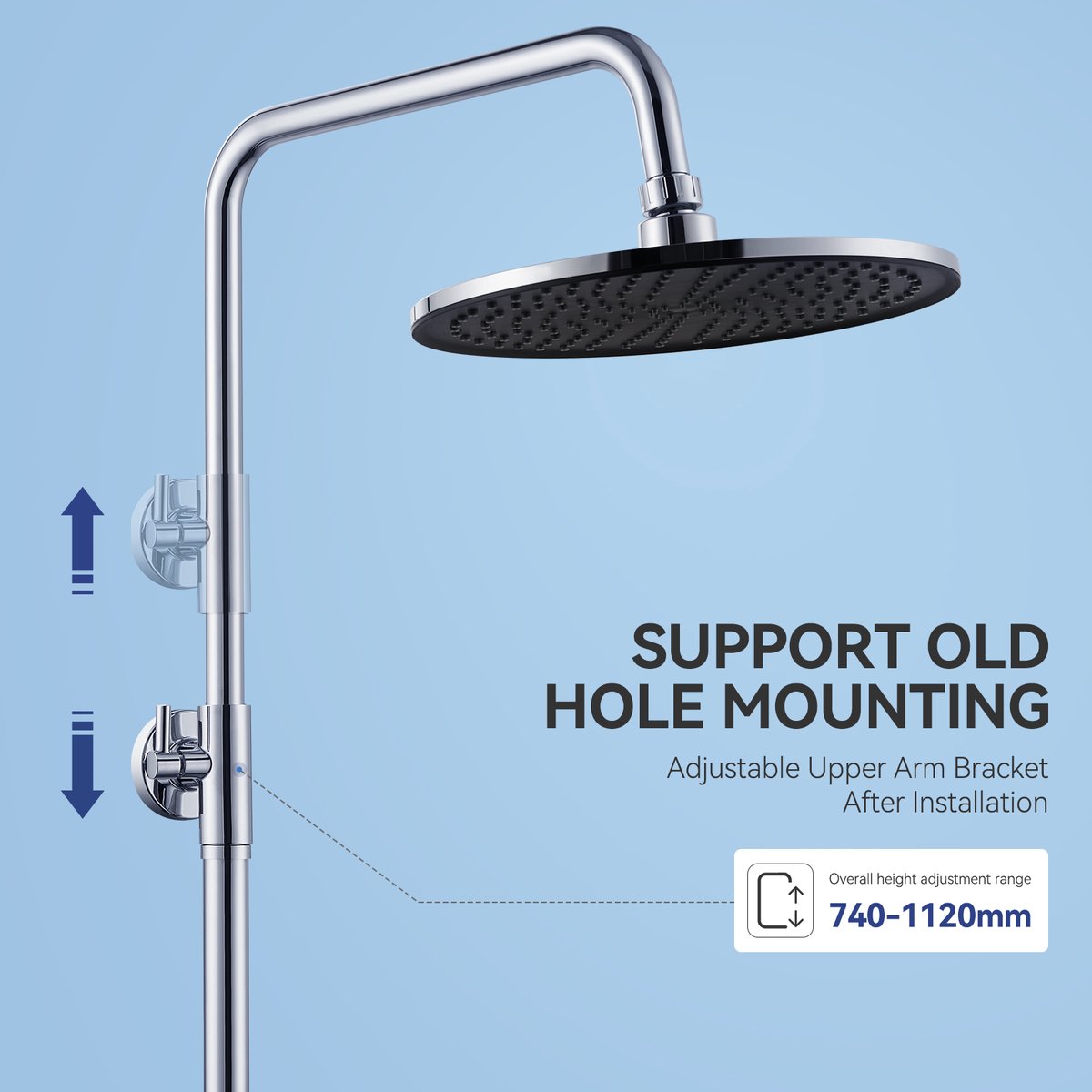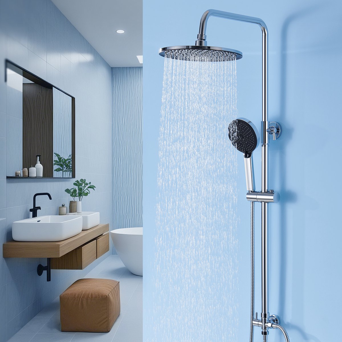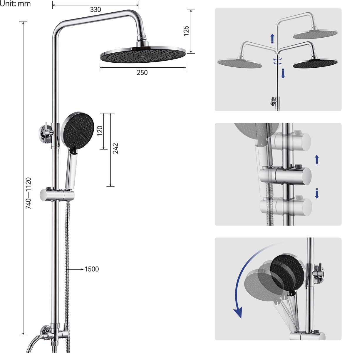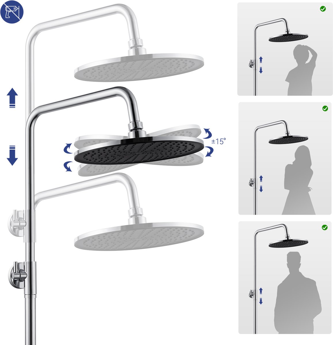 De set is voorzien van een in hoogte verstelbare muurbeugel, waardoor u geen nieuwe gaten hoeft te boren. U kunt de hoogte eenvoudig aanpassen tussen 74 en 112 cm, perfect afgestemd op elke gebruiker of situatie. De stevige, roestvrijstalen douchestang garandeert duurzaamheid en stabiliteit, terwijl de grote ronde hoofddouche van 25 cm lichaam omhult met gelijkmatige waterstralen voor een prettige douchebeleving.