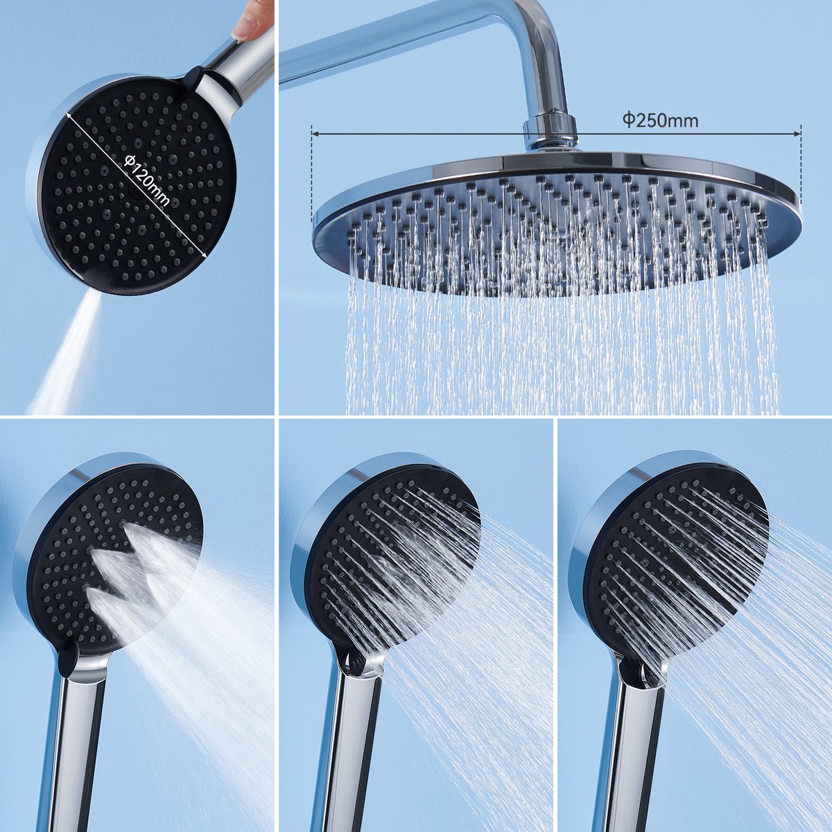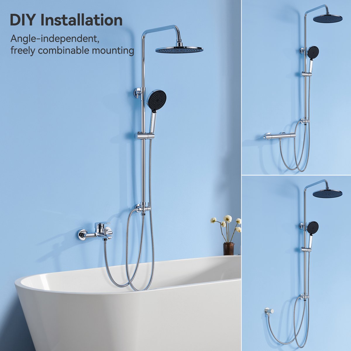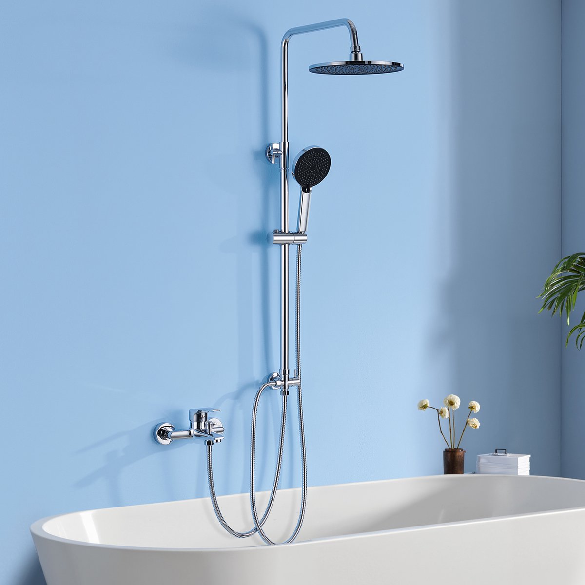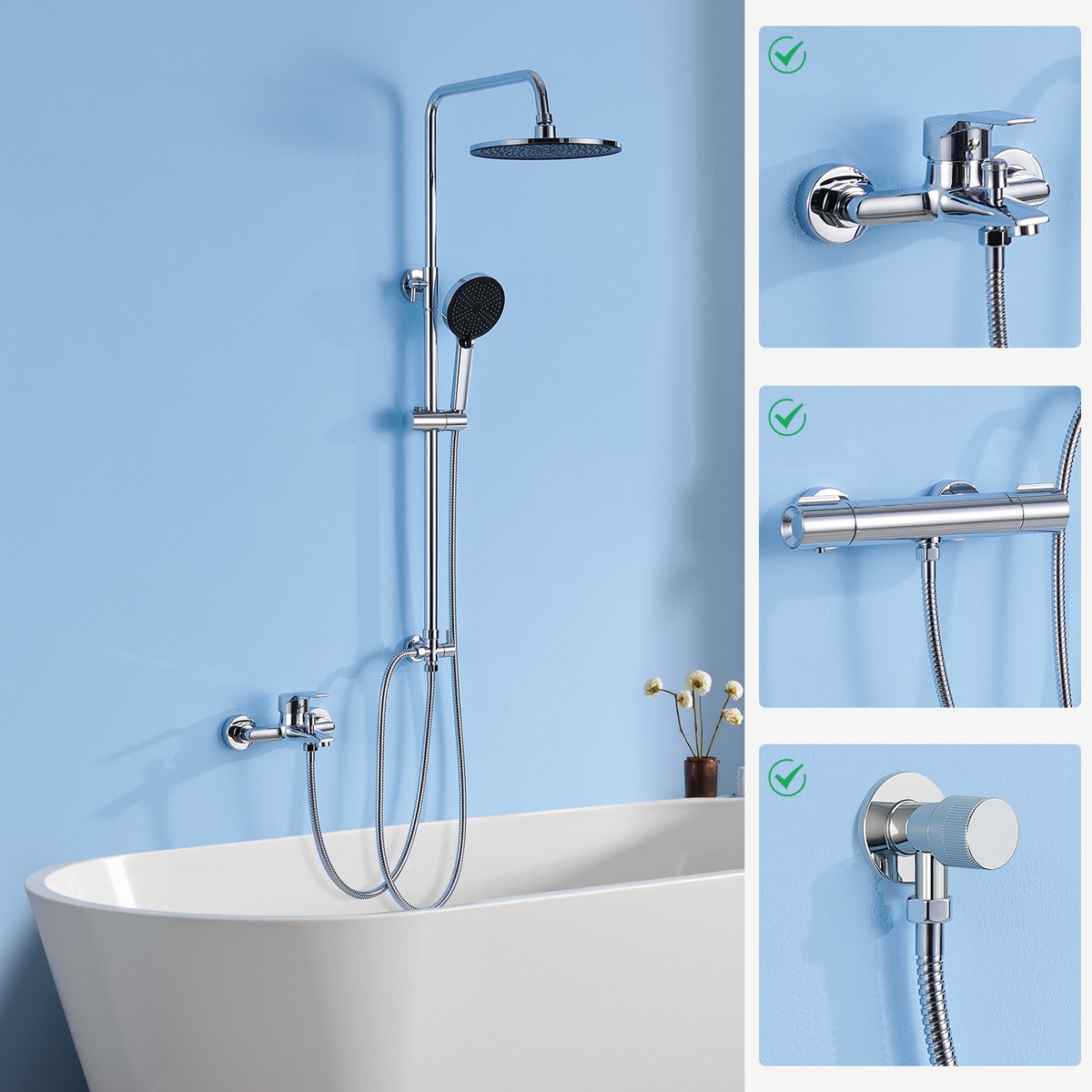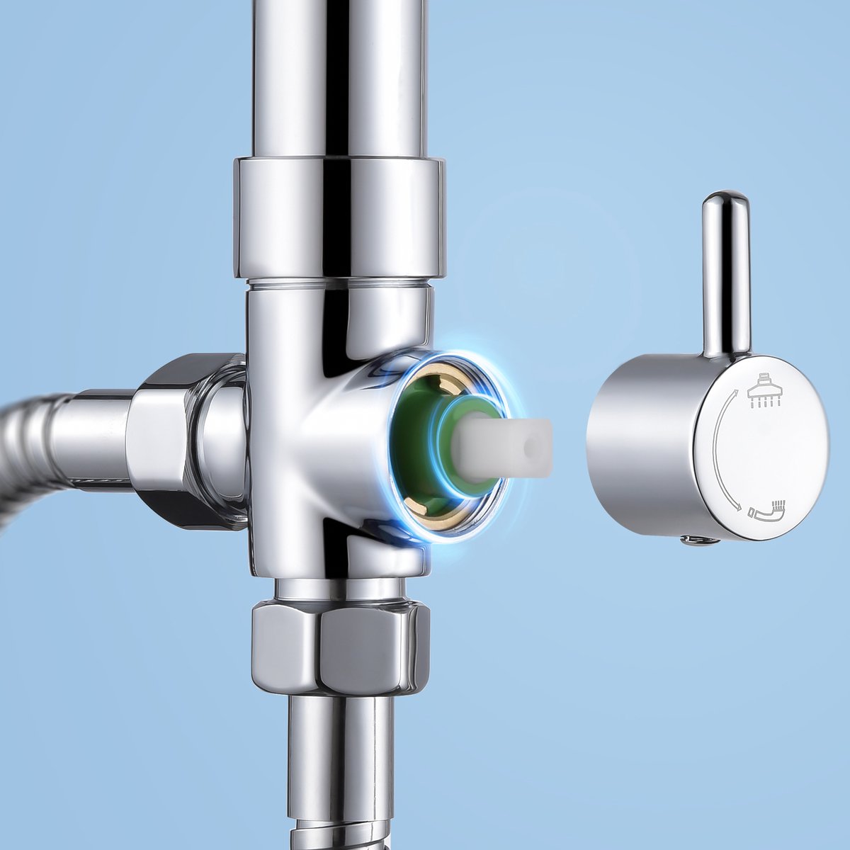 De set is voorzien van een in hoogte verstelbare muurbeugel, waardoor u geen nieuwe gaten hoeft te boren. U kunt de hoogte eenvoudig aanpassen tussen 74 en 112 cm, perfect afgestemd op elke gebruiker of situatie. De stevige, roestvrijstalen douchestang garandeert duurzaamheid en stabiliteit, terwijl de grote ronde hoofddouche van 25 cm lichaam omhult met gelijkmatige waterstralen voor een prettige douchebeleving.