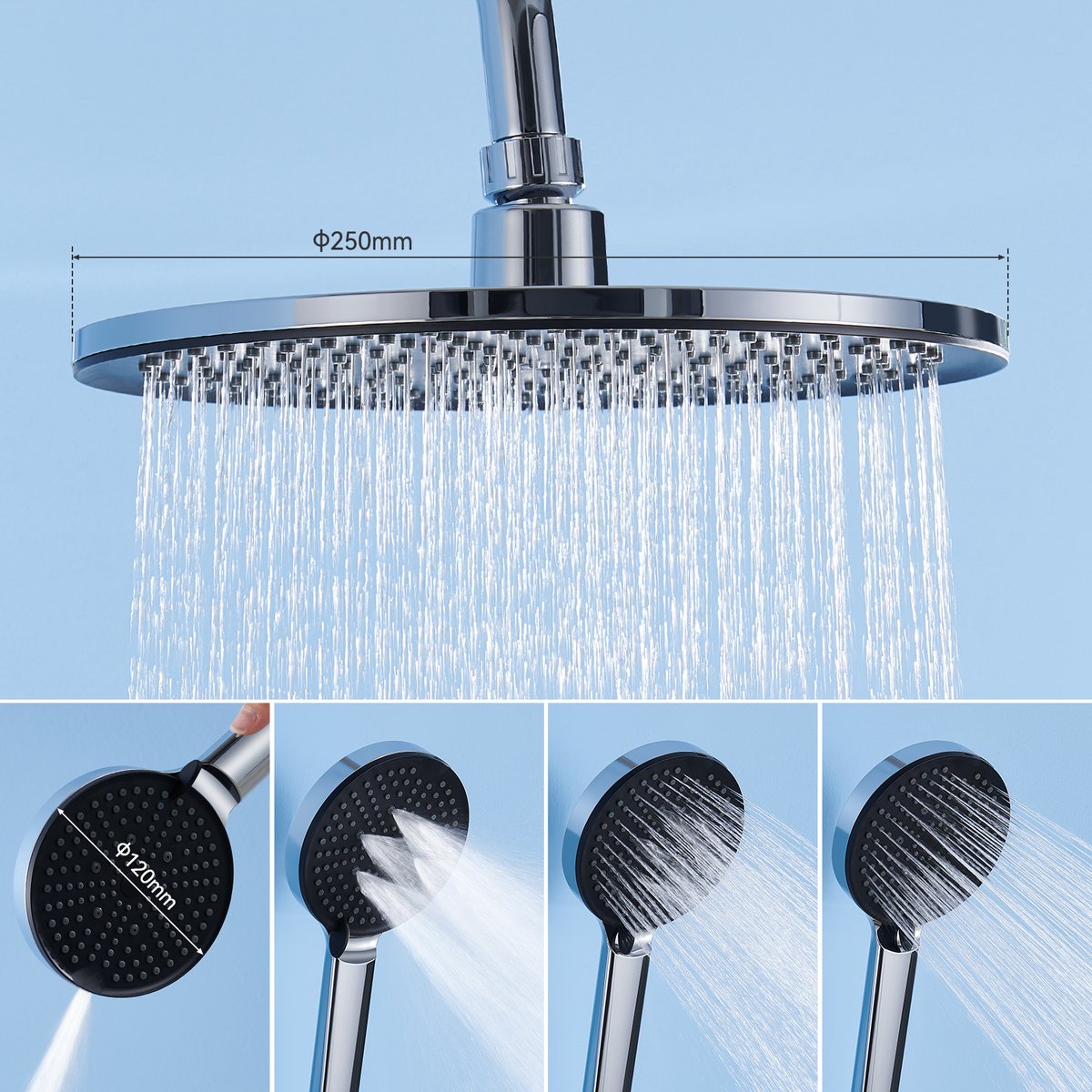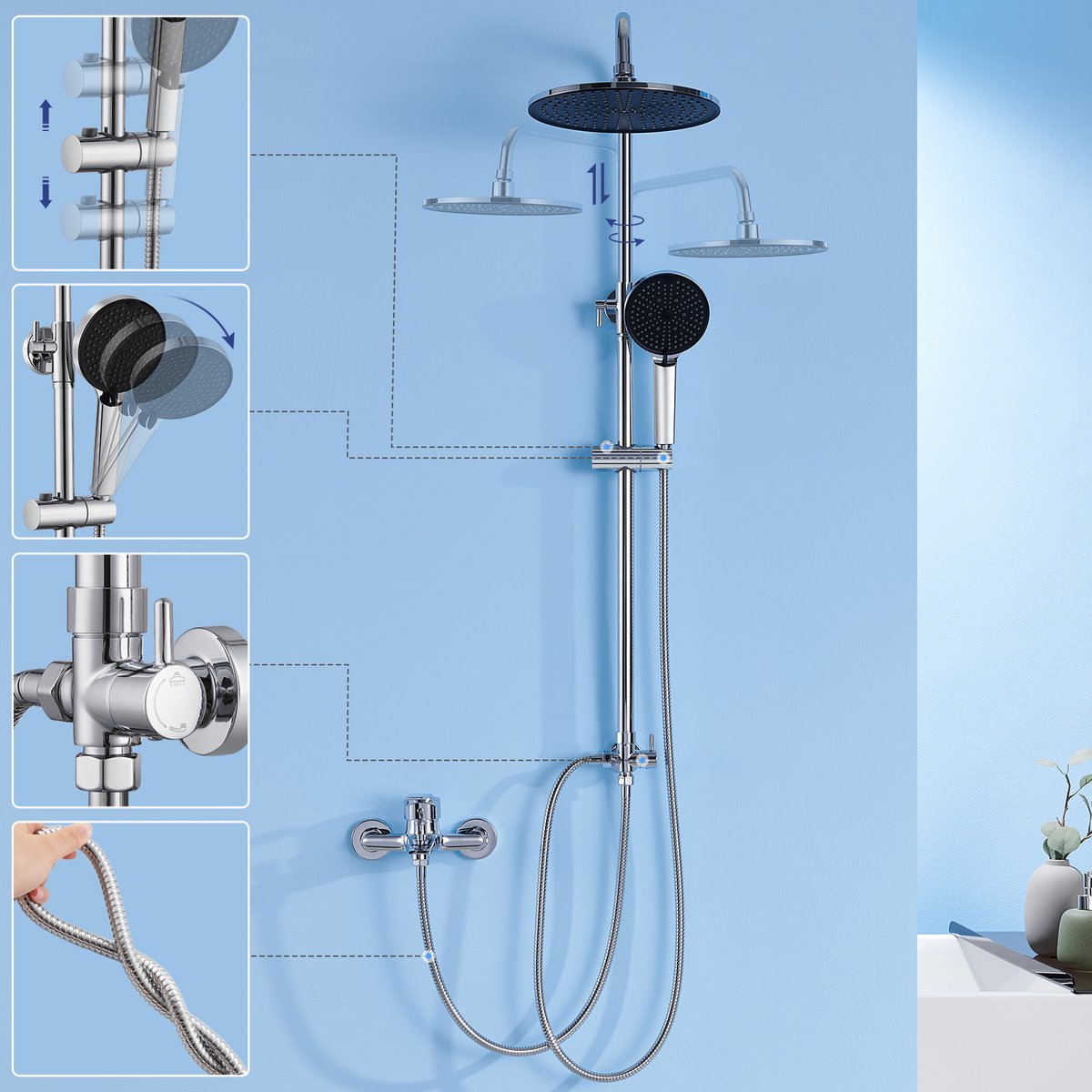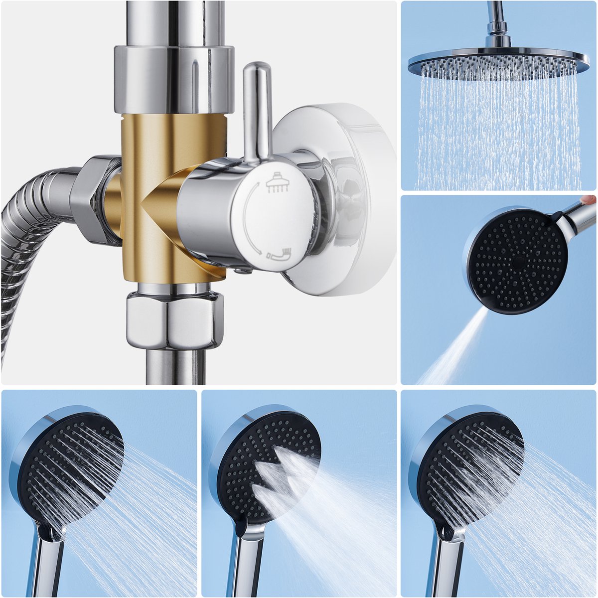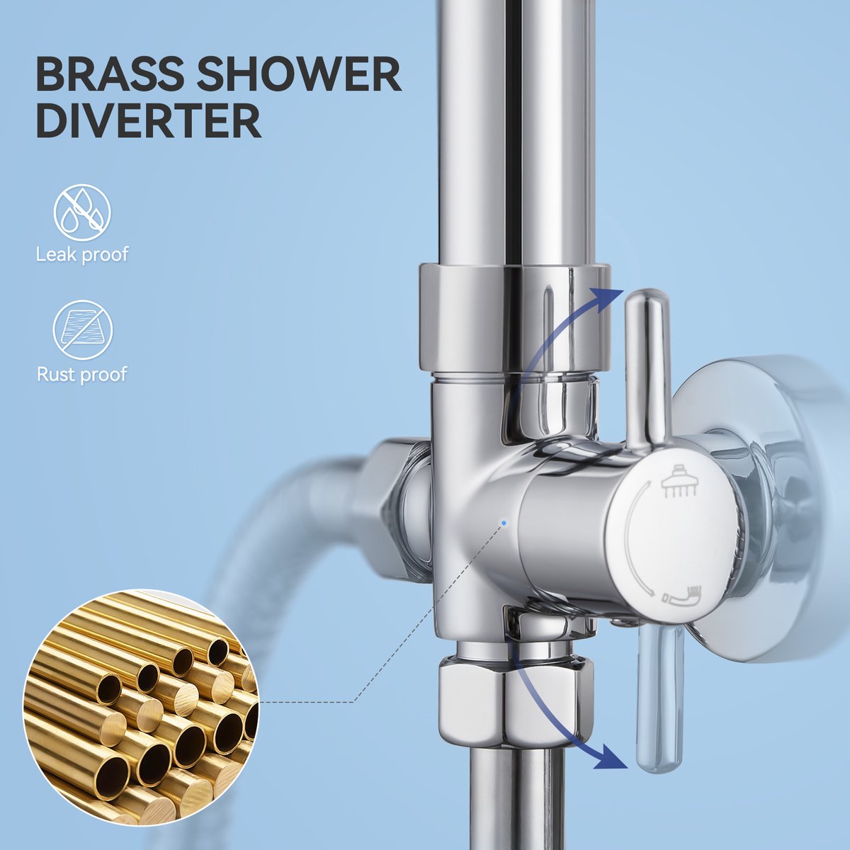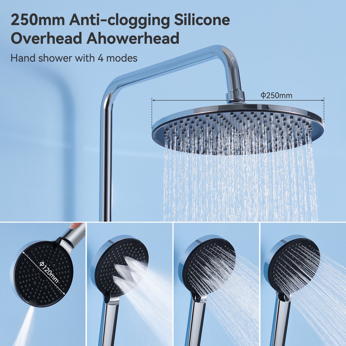 De set is voorzien van een in hoogte verstelbare muurbeugel, waardoor u geen nieuwe gaten hoeft te boren. U kunt de hoogte eenvoudig aanpassen tussen 74 en 112 cm, perfect afgestemd op elke gebruiker of situatie. De stevige, roestvrijstalen douchestang garandeert duurzaamheid en stabiliteit, terwijl de grote ronde hoofddouche van 25 cm lichaam omhult met gelijkmatige waterstralen voor een prettige douchebeleving.