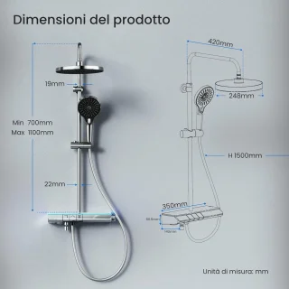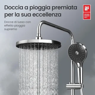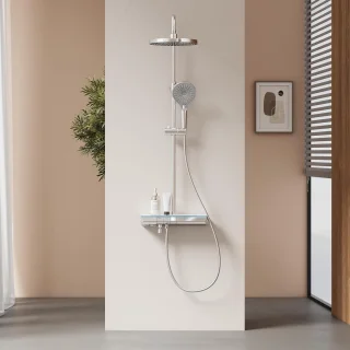 Deze douchekolom is ontworpen voor gebruiksgemak en comfort. De thermostaat voorkomt plotselinge temperatuurwisselingen, zodat u zorgeloos kunt douchen. Wissel snel tussen de regendouche en de handdouche afhankelijk van uw behoefte: ontspanning, snel afspoelen of gericht reinigen. Het geïntegreerde planchet biedt ruimte voor shampoo en zeep, zodat alles binnen handbereik blijft. Bovendien zorgt de chromen afwerking voor een tijdloze look die in vrijwel elk badkamerinterieur past.