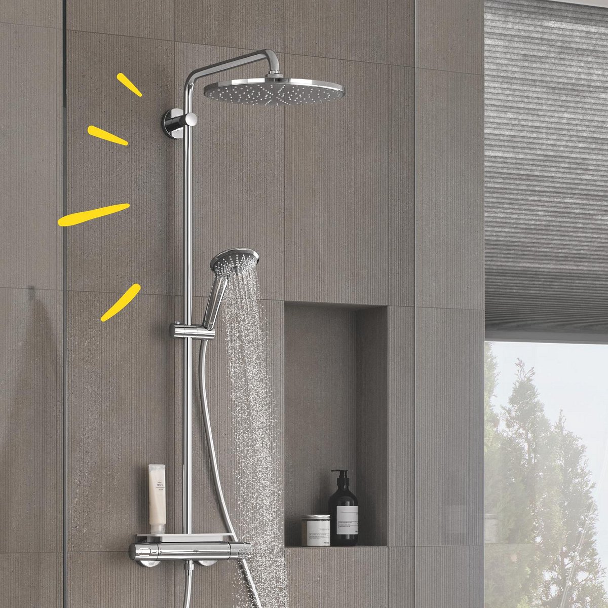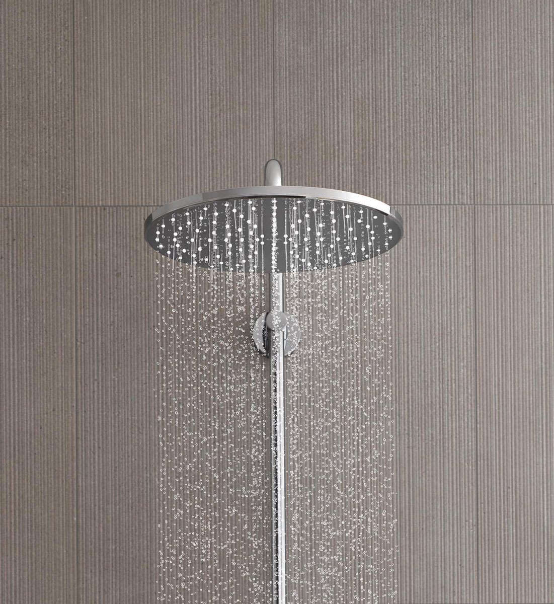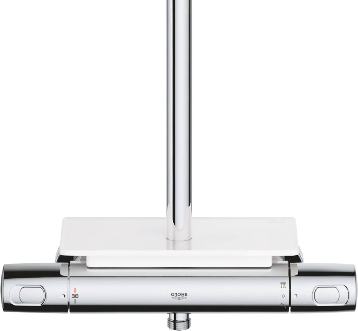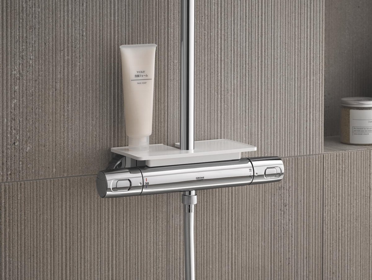 De elegante chroomafwerking geeft uw badkamer een strakke en tijdloze uitstraling. De uitgebreide afmetingen en hoogwaardige materialen maken dit systeem niet alleen duurzaam maar ook een echte eyecatcher. Dankzij de krasbestendige GROHE Long-Life coating behoudt de chroomfinish haar sprankelende glans jarenlang, terwijl het moderne ontwerp perfect aansluit bij elke badkamerstijl.