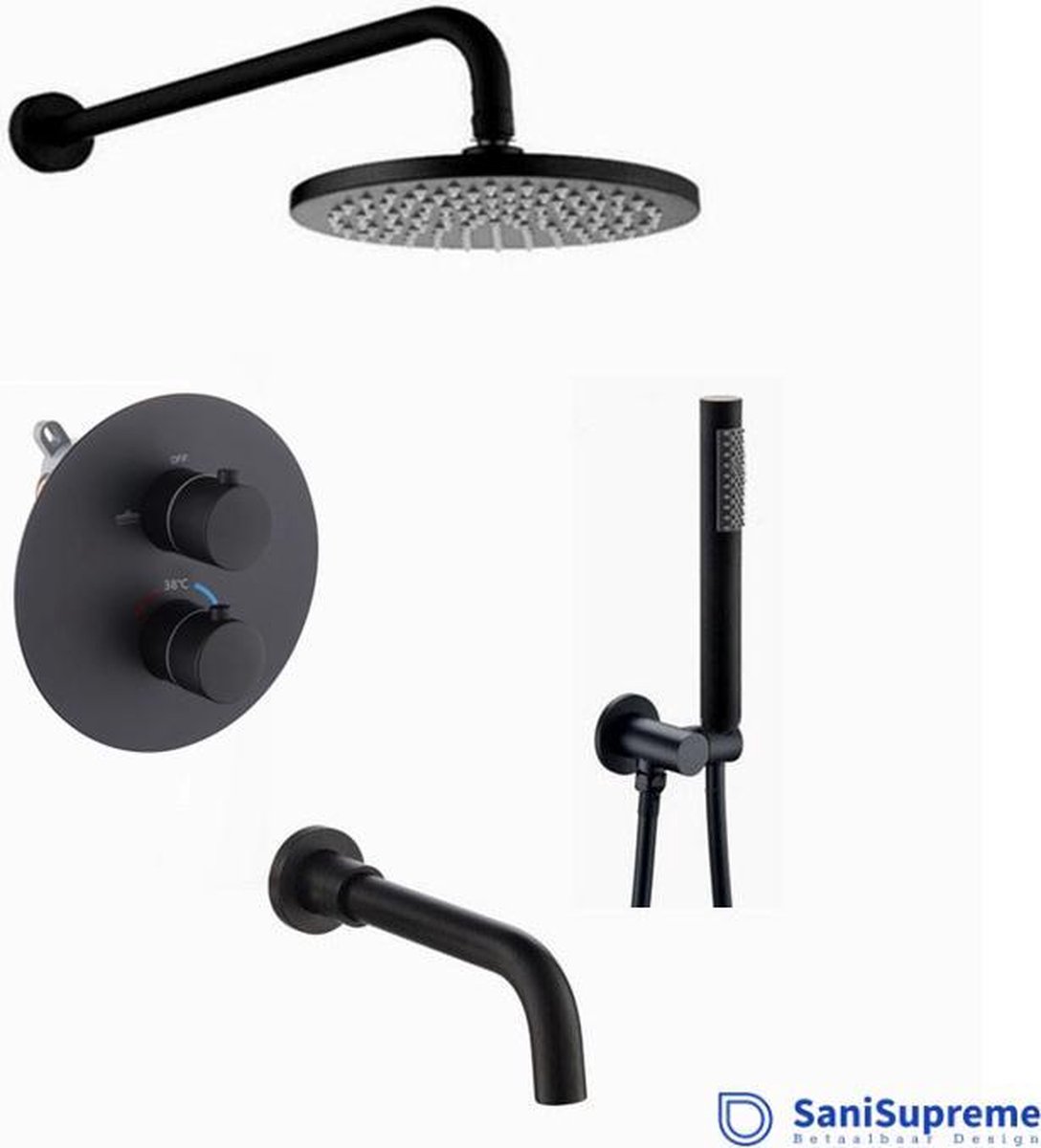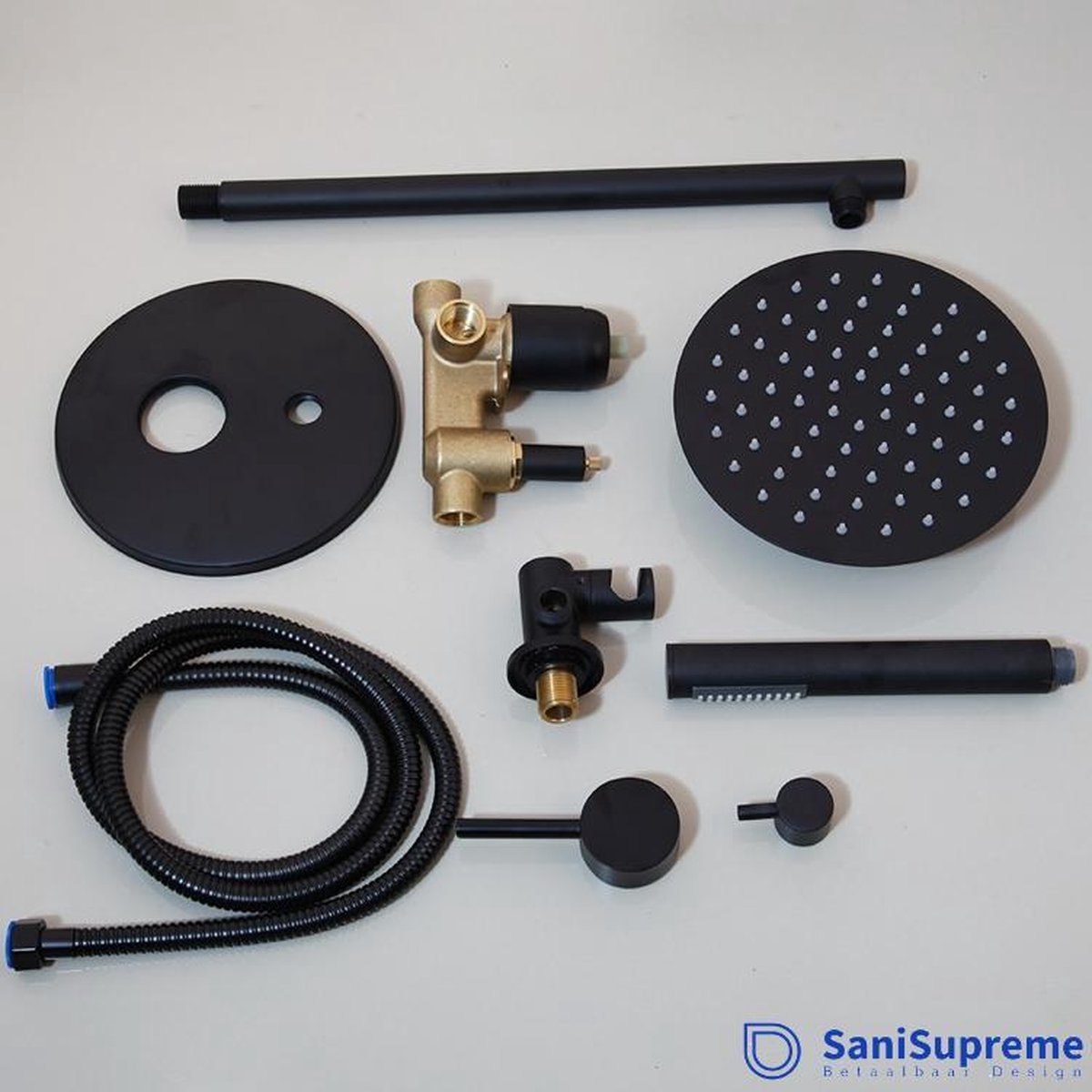 De SaniSupreme BlackLine serie straalt moderniteit uit met een chique mat zwarte finish die naadloos past bij elk badkamerinrichting. Alle inbouwonderdelen, inclusief de regelaars, worden vervaardigd uit robuust roestvrij staal en massief messing, wat garant staat voor jarenlange betrouwbaarheid en een luxe uitstraling. De bedieningsknoppen zijn ook gemaakt van hetzelfde hoogwaardige materiaal, waardoor u geen goedkoop kunststof tegenkomt. Een echte blikvanger die eenvoudig schoon te houden is met milde zeep, zonder schurende producten.