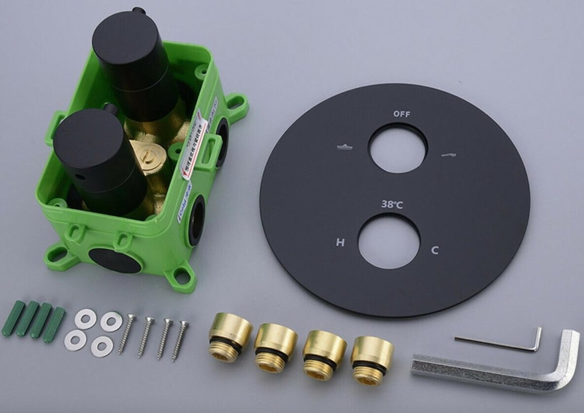 De set wordt compleet geleverd inclusief een ronde hoofddouche, multifunctionele messing regelunit met keramische schijven, handdouche met slang, en een inbouw voetenkraan die draaibaar is voor extra gebruiksgemak. De aansluiting is voorzien van G 1/2” maat, zodat installatie snel en eenvoudig gebeurt. Bovendien is het mogelijk om een voetenkraan in te bouwen die op de as draaibaar is, voor nog meer flexibiliteit (op verzoek, tegen een kleine meerprijs).