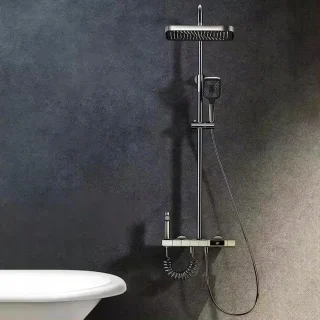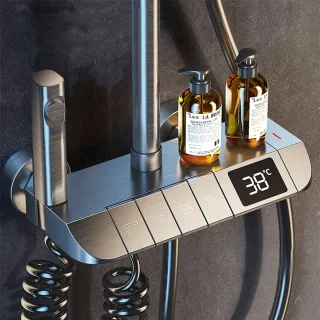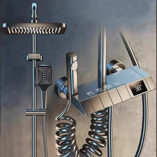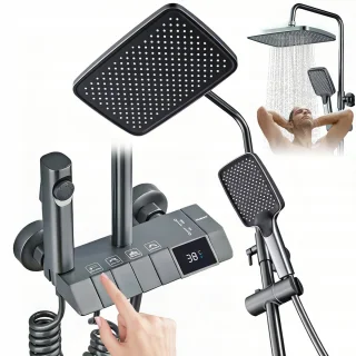 Transformeer uw badkamer tot een moderne wellnessruimte met deze complete, multifunctionele doucheset. De set combineert elegant design, gebruiksgemak en slimme techniek: een thermostatische temperatuurregeling met digitaal display, meerdere douchestanden voor ontspanning of snelle reiniging en hoogwaardige materialen die langdurig mooi blijven.