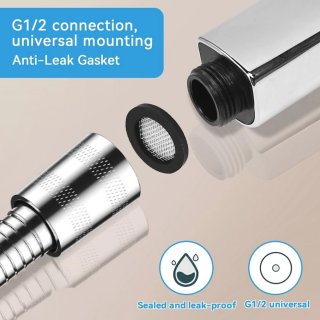 De handdouche is eenvoudig te monteren (opbouw) en wordt geleverd met een lekvrije afdichting voor directe installatie. Voor optimaal behoud van de waterstraal veeg je de siliconen sproeipunten af en verwijder je af en toe kalkaanslag met een zachte doek — geen ingewikkeld onderhoud nodig.