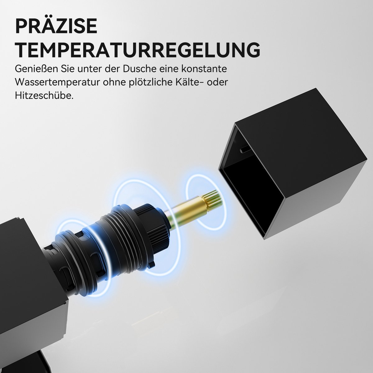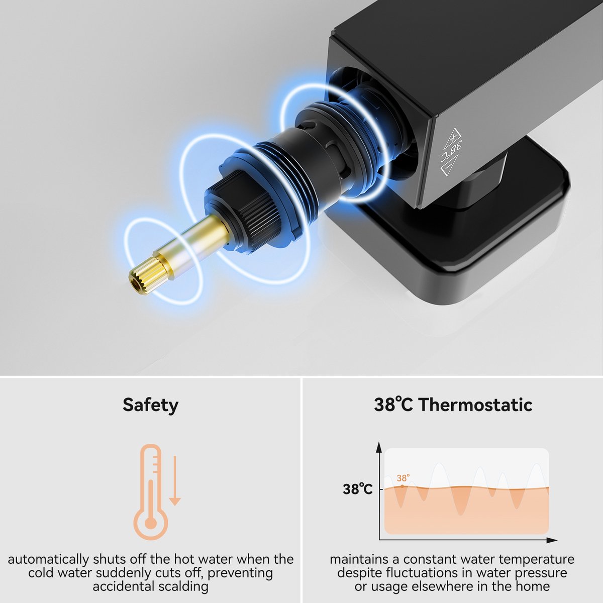 - Thermostatische temperatuurbeveiliging op 38 °C: Veilig douchen zonder angst voor verbranding. De temperatuur wordt automatisch geregeld, en met één klik kunt u de gewenste warmtetemperatuur aanpassen en vastzetten voor de volgende keer.
